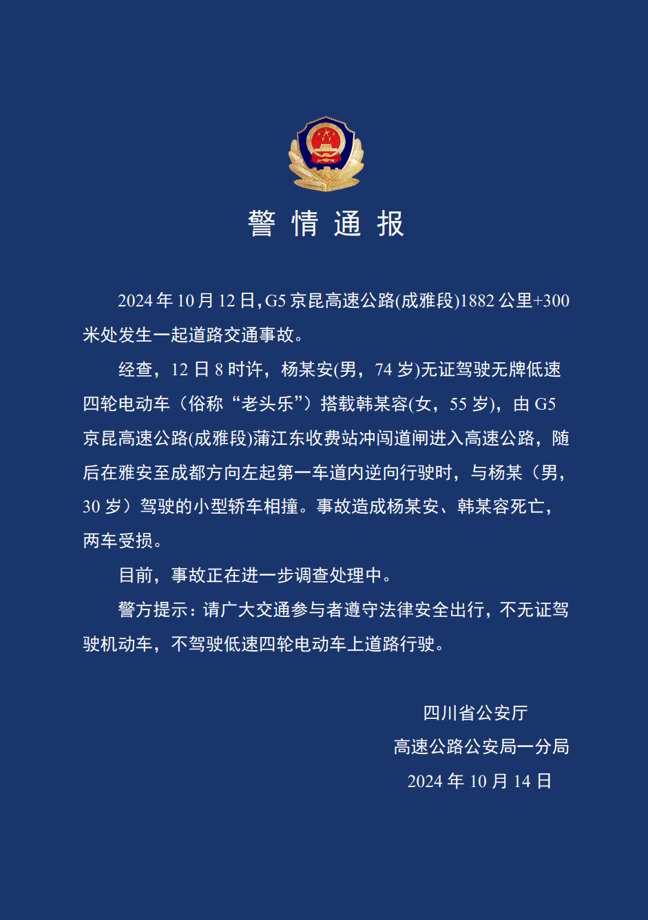 經(jīng)查,12日8時許,楊某安無證駕駛無牌低速四輪電動車搭載韓某容,由G5京昆高速公路蒲江東收費站沖闖道閘進入高速公路,隨后在雅安至成都方向左起第一車道內(nèi)逆向行駛時,與楊某駕駛的小型轎車相撞。事故造成楊某安、韓某容死亡,兩車受損。