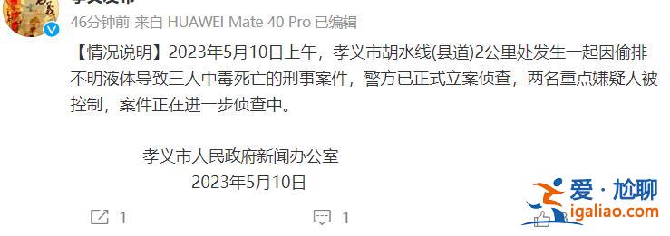 @孝義發布 消息,2023年5月10日上午,孝義市胡水線2公里處發生一起因偷排不明液體導致三人中毒死亡的刑事案件,警方已正式立案偵查,兩名重點嫌疑人被控制,案件正在進一步偵查中。...
