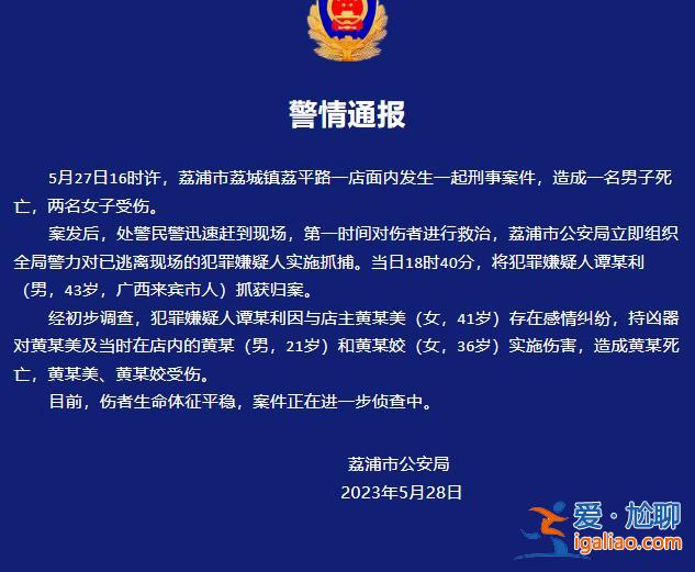 荔浦警視微信公眾號消息,5月27日16時許,荔浦市荔城鎮荔平路一店面內發生一起刑事案件,造成一名男子死亡,兩名女子受傷。...