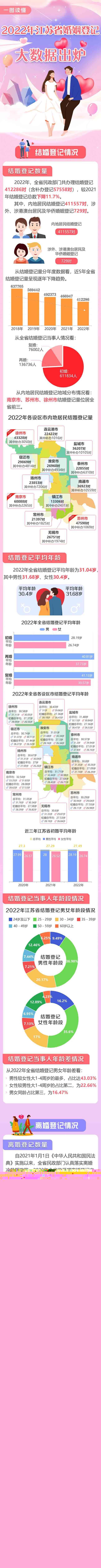 現(xiàn)代快報(bào)消息,2月13日,江蘇省民政廳公布了2022年江蘇省婚姻登記大數(shù)據(jù)?,F(xiàn)代快報(bào)記者了解到,2022年,全省民政部門辦理結(jié)婚登記超過41萬對。初婚平均年齡27.49歲,比2021年晚了0.2歲。近21萬對夫婦申請離婚。...